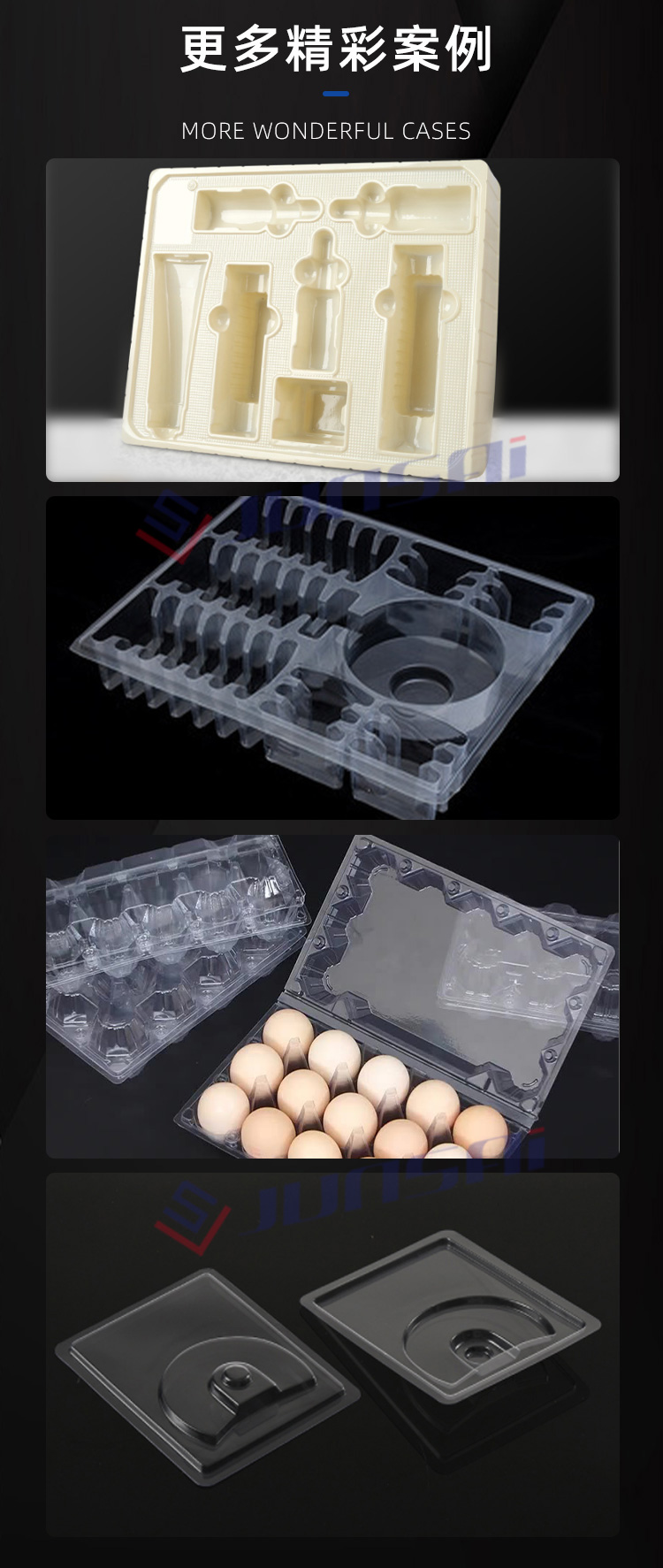這臺全自動正負壓吸塑機適用于PS、PVC、PET、PP等塑料原材的成形,可以用來生產各種盒、碟、碗、電子托盤、杯蓋等塑料容器和包裝產品,如市面上常見的水果盒、糕點盒、保鮮盒、電子中轉托盤、玩具包裝等。